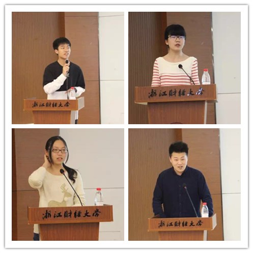 最后,4位今年以优异成绩考上国内外研究生的13级学长学姐依次上台分享了他们出国、考研的经验。叶焕鹏和林易汝分别被英国的巴斯大学和曼彻斯特大学录取。他们就如何选择留学国家、专业院校,如何自己申请学校给出建议,并介绍雅思、托福、GMAT等重要考试,具体推荐了一些有助于加强英语听、说、读、写的平台和资料。而对于国内研究生考试,蔡凯星和田嘉哲在是否报培训班、如何选择辅导教材等方面提出个人见解,并让同学们参考自己在考研阶段的日程安排,告诫大家在学习过程中坚持的重要性。