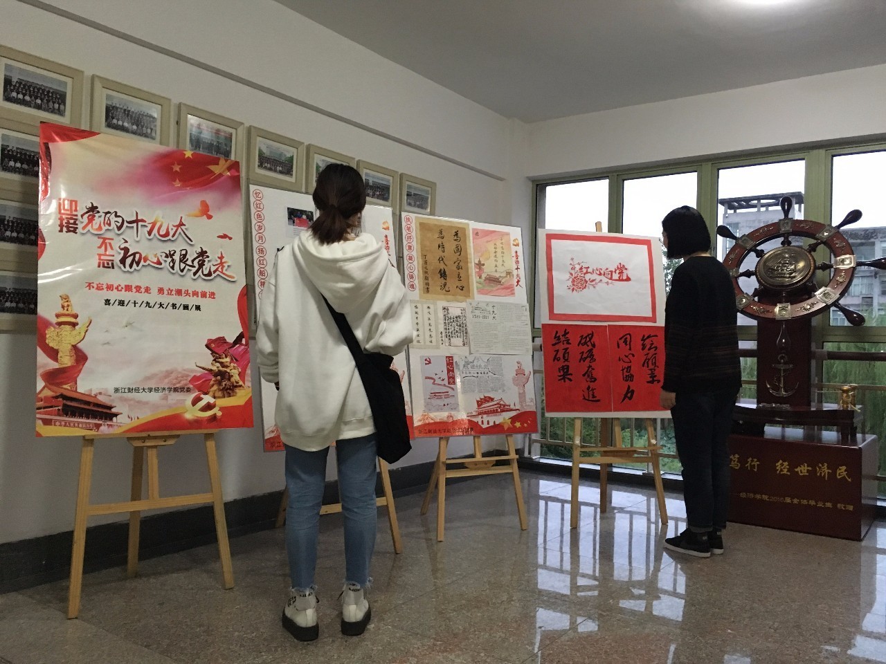 楼一楼组织展出了十八次党代会极简史展板,方便师生共同回顾、学习历届党代会的内容精神;举办了以“迎接党的十九大,不忘初心跟党走”为主题的书画展,广泛地向同学们征集了书法、手抄报、剪纸、漫画等各种形式的作品,借此来表达对党的美好祝愿;开展“忆红色岁月 扬红船精神”—老党员采访展,师生党员暑假走访浙江省11个地市采访20余名老党员,向老党员们学习致敬。