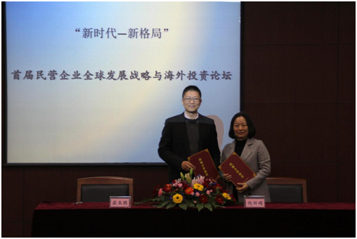 随后浙江省境外投资企业协会秘书长倪丽娟女士和浙江财经大学茹玉骢教授在会场上进行了浙江财经大学民营企业全球发展战略与海外投资协创中心和浙江省境外投资企业协会战略合作协议的签约仪式。