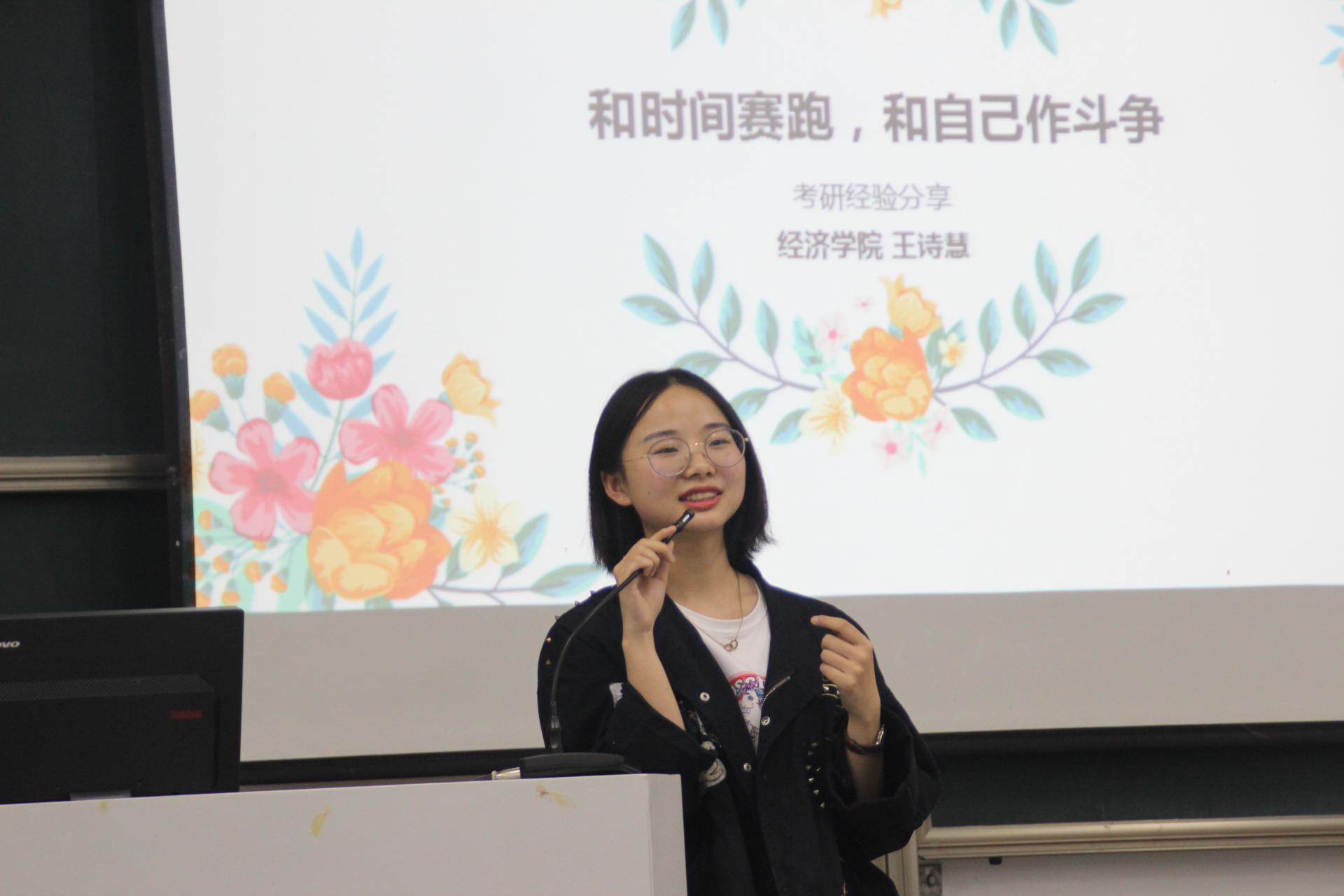 随后,今年成功考取浙江大学金融专硕的王诗慧和西方经济学专业的胡稳权同学与大家分享了他们的考研经验。王诗慧坦言在遇到感觉自己不如他人的困境时,会想办法鼓励自己,保持自信。同时她制定了十分详细的备考计划,并按照计划持之以恒地坚持备考。胡稳权的备考之路也绝非轻松。不管是在暑假时留校的备考,还是系统的复习计划,都按照自己的计划坚持下来,一步步向着自己的目标前进。