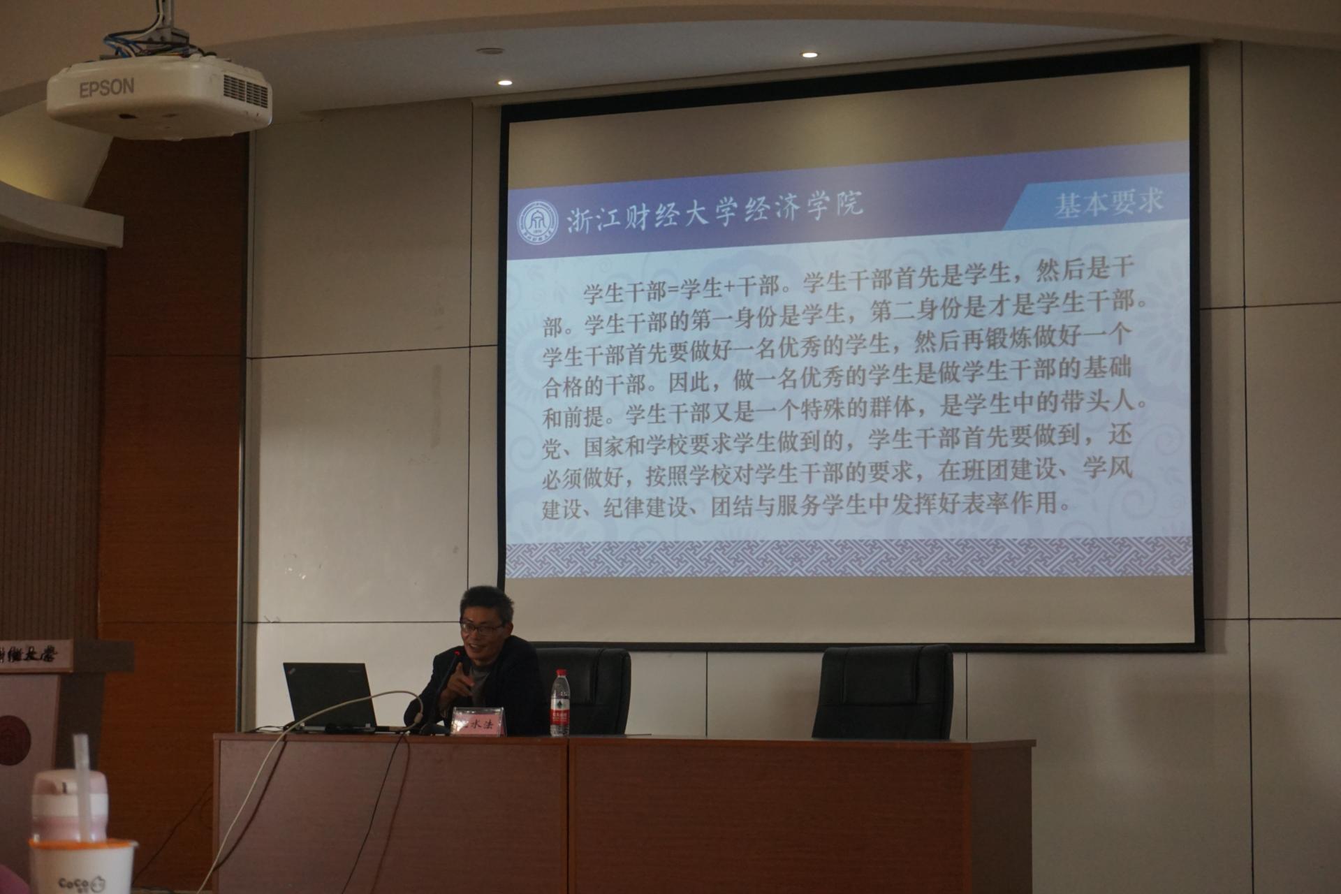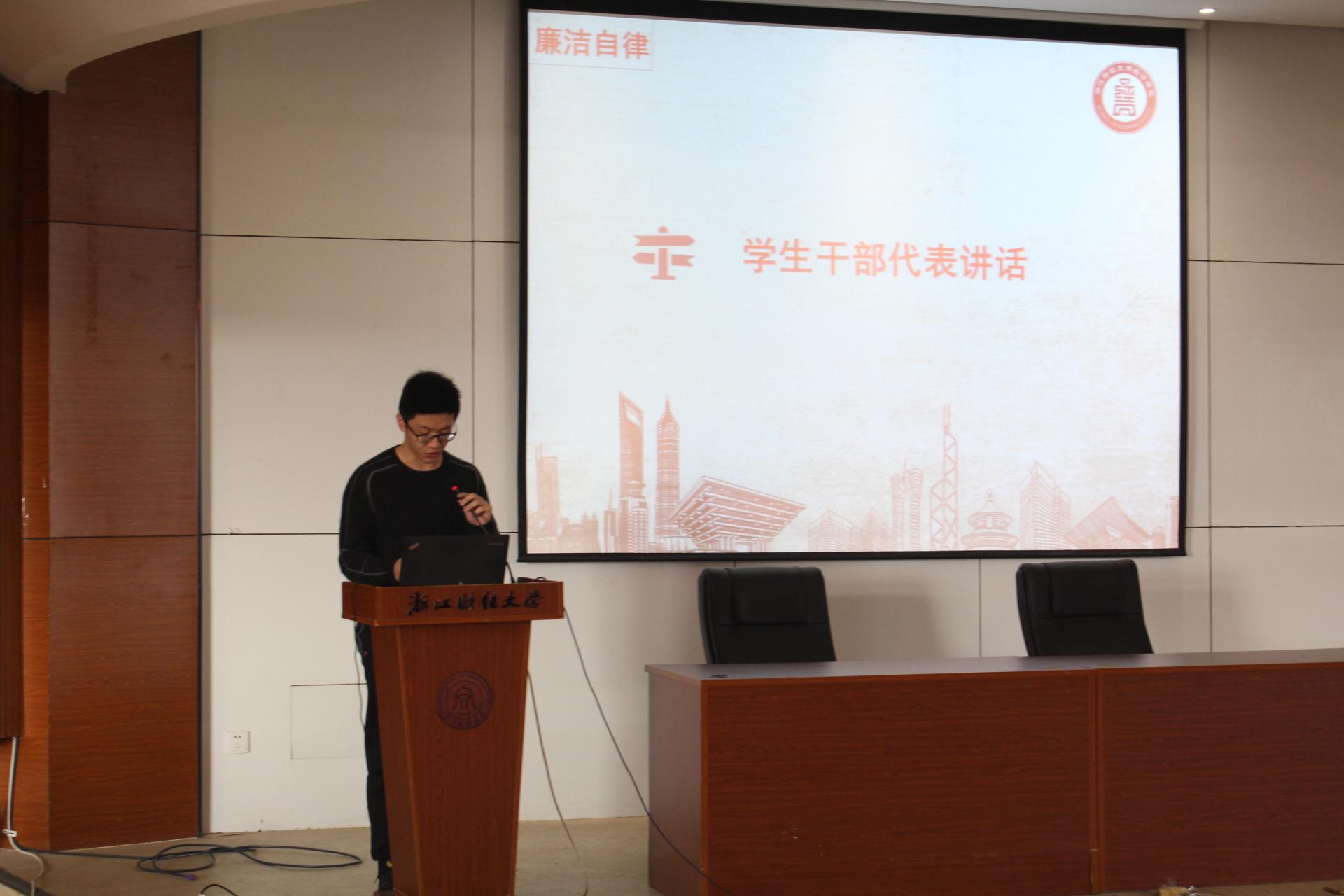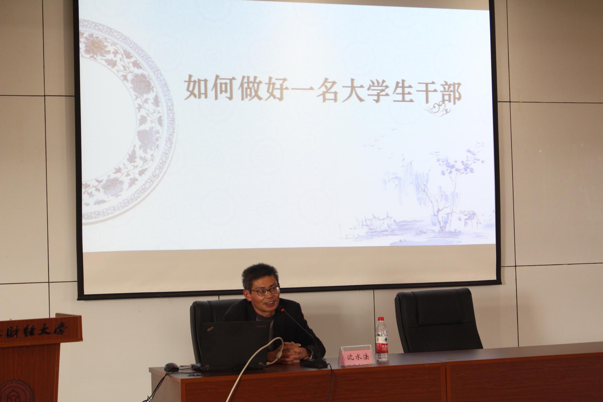 党委书记沈水法从如何做好一名大学生干部对学生干部进行廉洁教育。他认为学生干部先是学生后是干部,做一名优秀的学生是做好学生干部的基础和前提。学生干部是学生中的带头人,党、国家和学校要求学生做的,学生干部首先要做到,还必须做好,在学业、班团建设、学风建设、纪律建设、团结与服务学生中严格要求自己,发挥好表率作用。