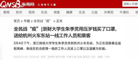 团员青年朱李灵同学在看到疫情之后,第一时间联系学校团委“一元钱”工程的负责人,表达自己想用压岁钱购买应急物资,驰援疫情防控一线的心愿,终于通过校团委辗转来回采购了3000个口罩,最终在2月4日下午送到了杭州火车东站工作人员手中,为正在迎接春运返程高峰、奋战在抗击疫情一线的工作人员送上温暖与祝福。澳门六合彩app