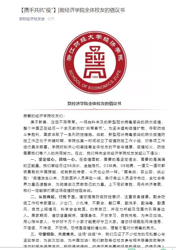 校友会面向全体经院人发出倡议,凝聚共识,万众一心,众志成城共同抗“疫情”。同时,澳门六合彩app