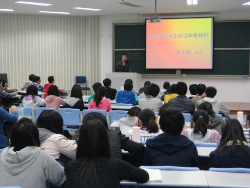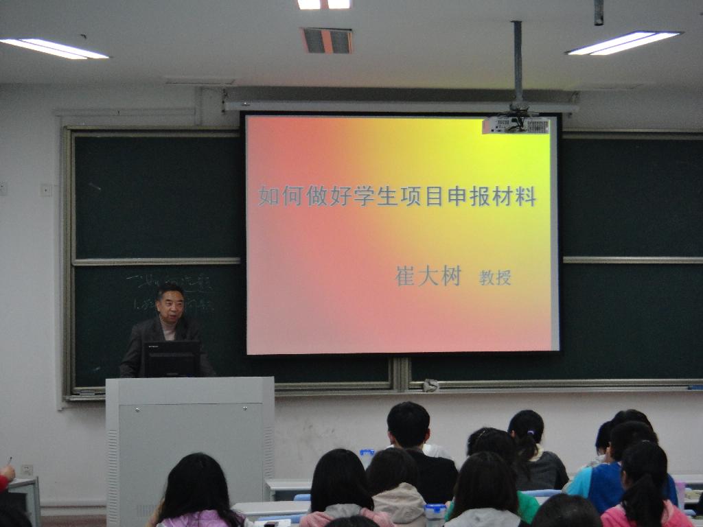 楼111教室,崔大树教授应邀作了关于“如何做好学生项目申报材料”的讲座。
