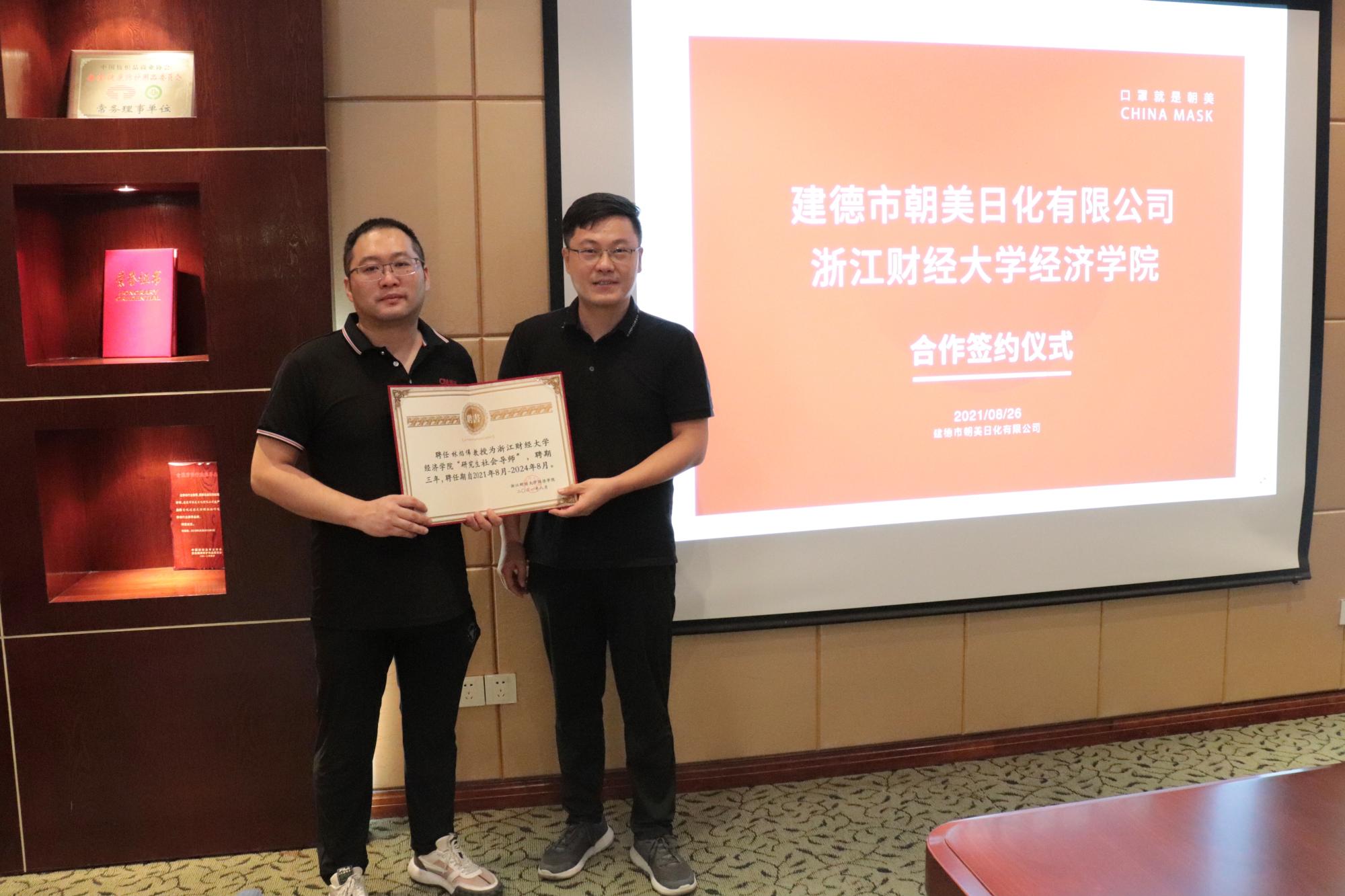 “研究生社会导师”聘书,胡亦琴、崔泰铭为建德朝美日化副总经理朱利平、胡庆辉颁发“创业导师”聘书。