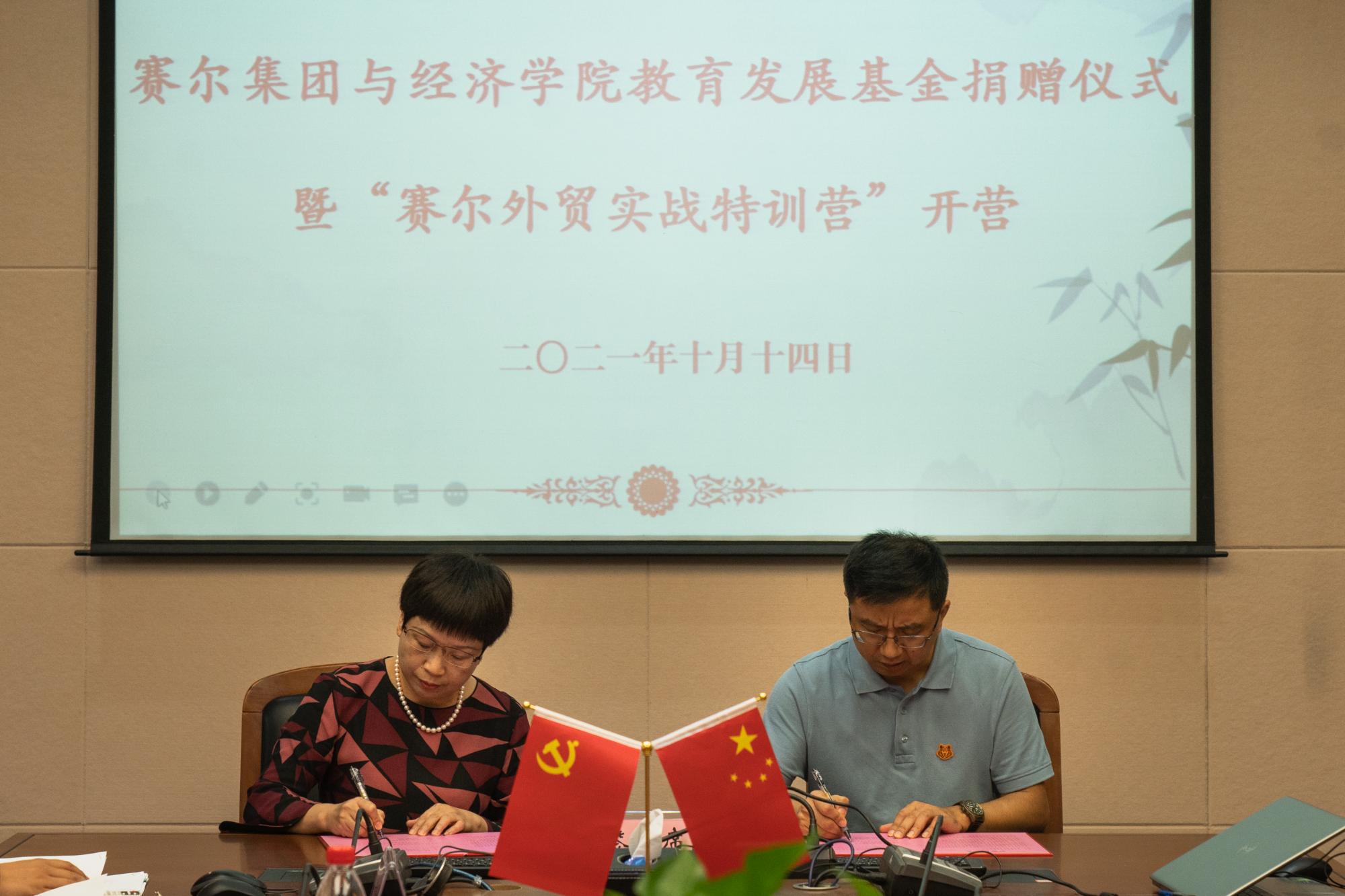 与宁波赛尔集团举行教育发展基金捐赠签约仪式暨“赛尔外贸实战特训营”第一期开班仪式,联通校企双方资源,推动人才培养再上新台阶。宁波赛尔集团副总裁方永强、招聘经理蒋丽妮、党委书记胡亦琴、党委副书记崔泰铭,辅导员及特训营学员代表出席仪式。