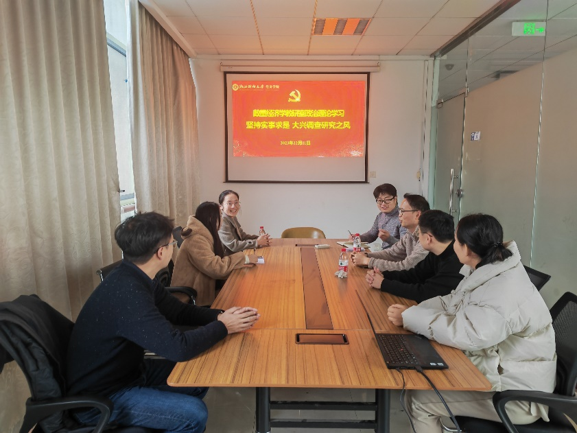 活动一开始,大家进行了“坚持实事求是,大兴调查研究之风”的政治理论学习。不论是科学研究还是教学都必须贴近现实、了解真相,为此我们需要多和同学们交流、多与企业和政府接触,以理解他们所处的环境、所关心的问题。