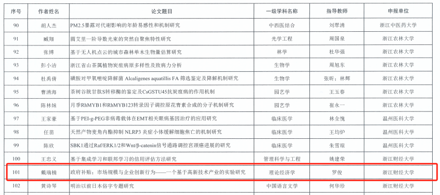 在评选中再创佳绩,共2篇学位论文入选。邵慰老师指导的博士学位论文《“双碳”背景下环境税费政策的绿色投激励效应研究》(学生:杨珂)获评浙江省优秀博士学位论文提名论文;罗俊老师指导的硕士学位论文《政府补贴:市场规模与企业创新行为——一个基于高新技术产业的实验研究》(学生:戴瑞楠)获评浙江省优秀硕士学位论文。其中,杨珂的博士学位论文是全省唯一入选的应用经济学一级学科优秀博士学位论文提名论文。本次全省共评选122篇优秀硕士学位论文,理论经济学入选2篇,戴瑞楠的硕士学位论文为其中之一。