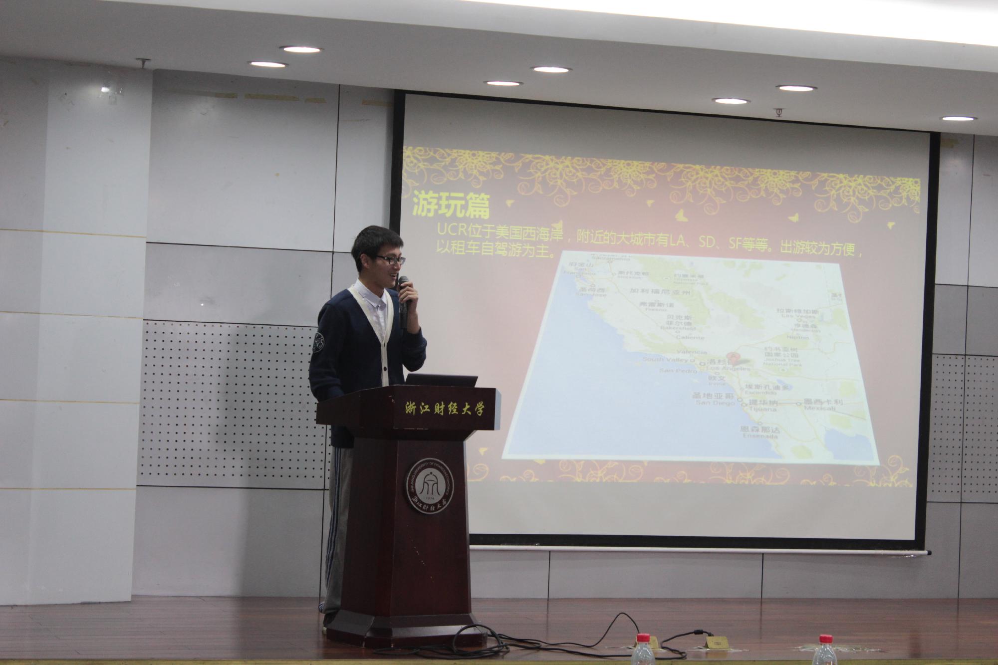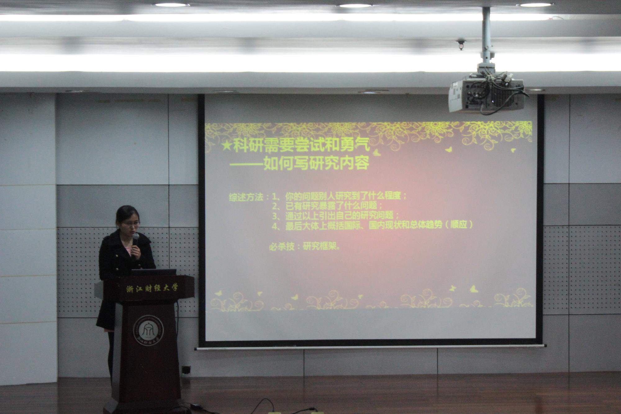 “安逸、懈怠不是青春的代名词,奋斗、拼搏才能创造鲜亮的人生。” 10经济班的袁璐四年中荣获多项国家级、省级、校级荣誉,在学术研究上,更是取得了不错的成绩。她重点与同学们分享了自己申请挑战杯的经历,讲述如何进行科研,并分别从组队、选题、目的、现实意义、内容以及写论文等方面给出了建议。坚持——是学业、工作皆优秀的10国贸班王佳斐的座右铭,双专业,实习,成功申请浙江省“新苗人才计划”,国家级挑战杯成功立项、校学生会副主席……紧凑的生活,短暂的时间,王佳斐给了八个字:负责、理解、坚持、感动!曾获“外研社杯”大学生英语写作大赛全国二等奖的11国贸班沈冰沁,结合自己学英语的经验,让大家了解到其实学英语并不难,兴趣和坚持是成功的首要条件。从美国留学归来的11国贸班陈宇豪,以及从台湾回来的11国贸班詹莜则分别结合自己在外求学的经历,为大家讲述了不同地域的风土人情及求学趣闻,为打算外出求学的学子提供了宝贵的经验。