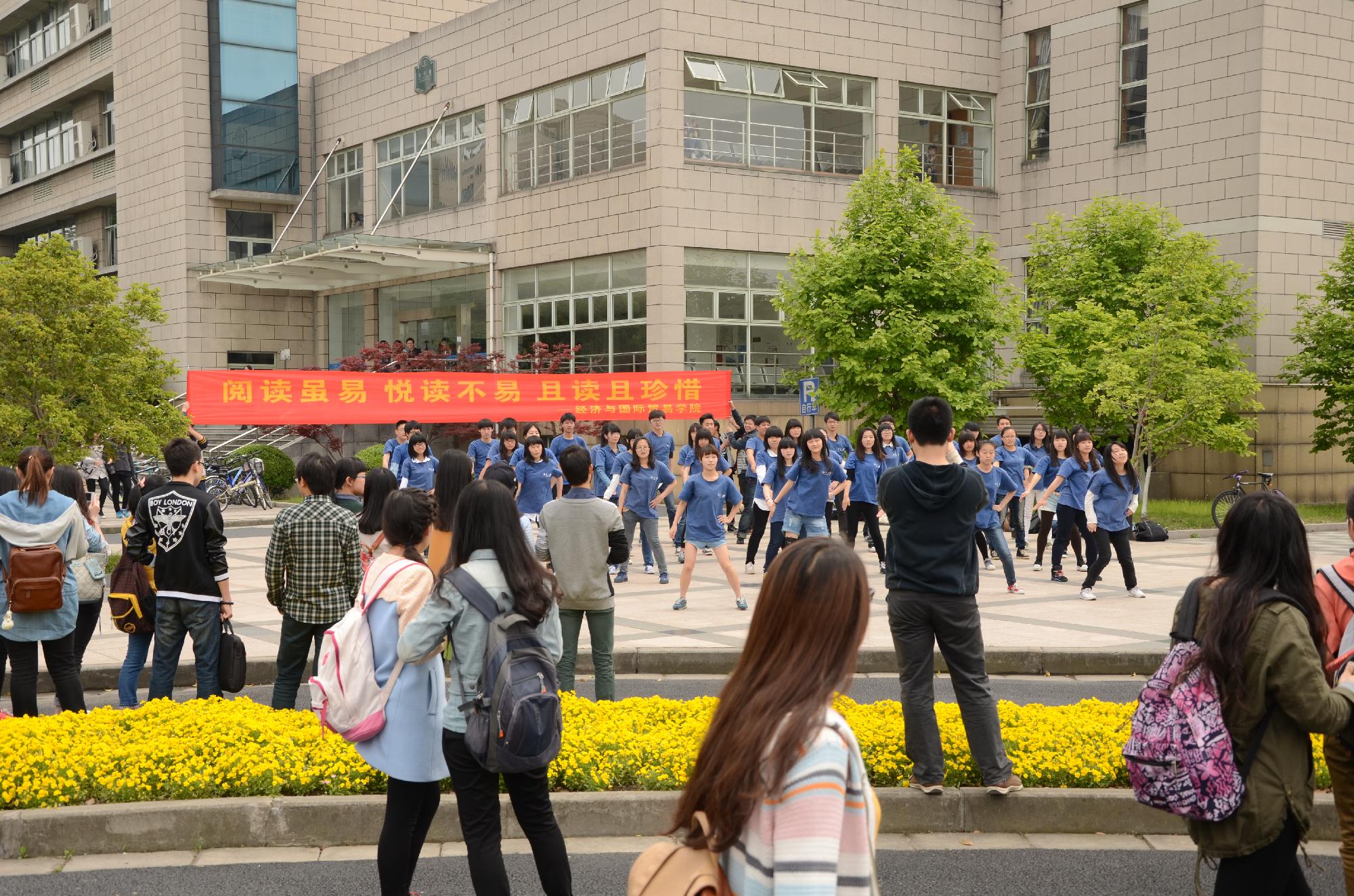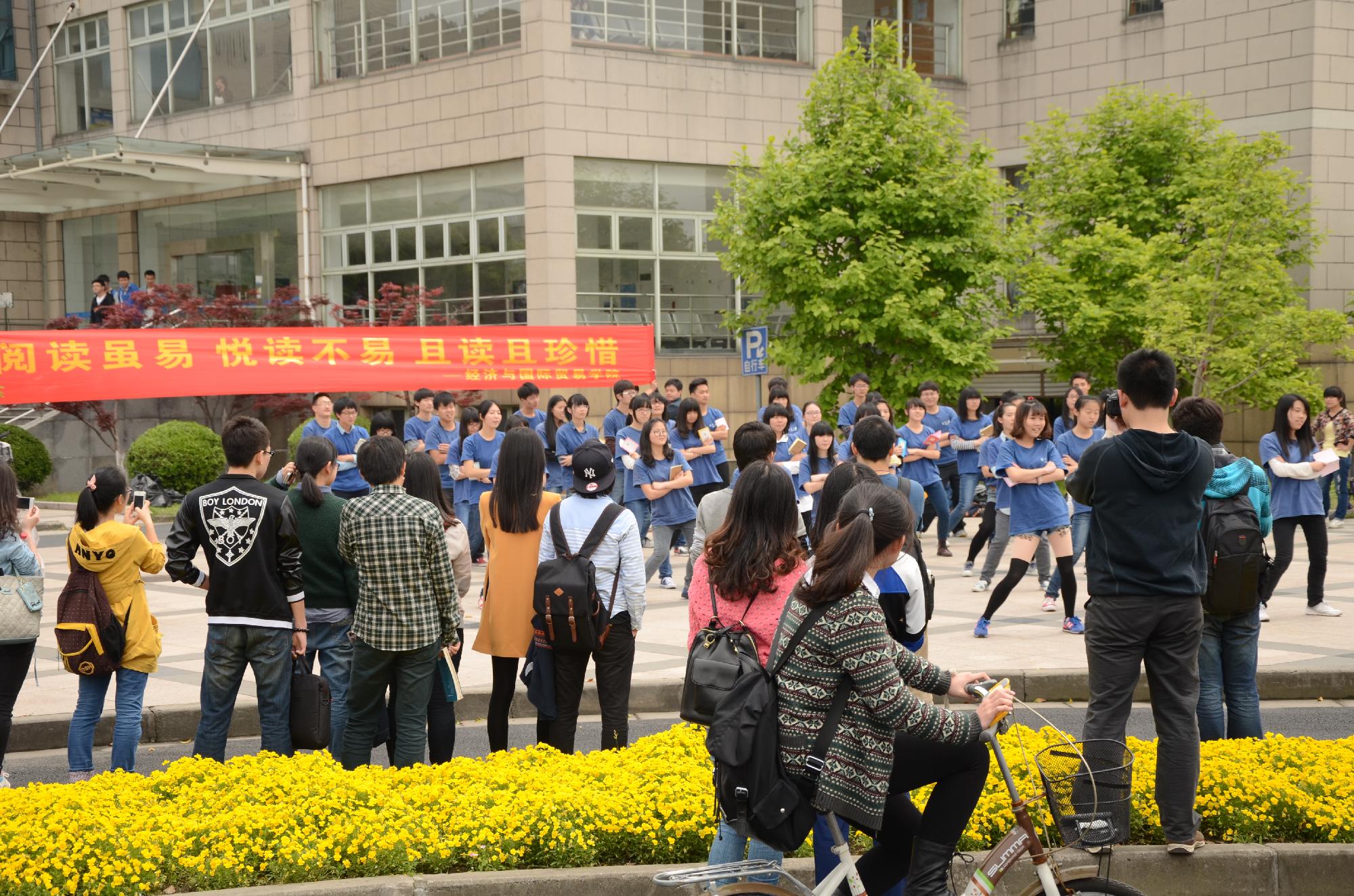 为什么会有这次的“快闪”活动?教学楼前的“阅读虽易,悦读不易,且读且珍惜”的横幅很好的回答了这个问题。原来,今天是世界读书日,浙江财经大学经济与国际贸易澳门六合彩app