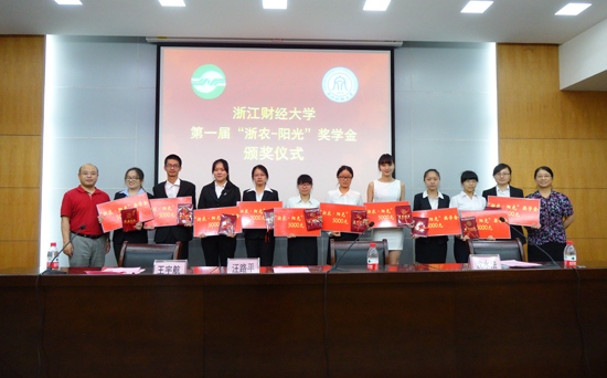 6月13日上午,我校举行浙江财经大学第一届“浙农—阳光”奖学金颁奖仪式。经层层展示评比,澳门六合彩app 12级区域经济学专业研究生张燕和11级国贸1班本科生冯瑶瑶在20位候选人中脱颖而出,荣获第一届“浙农—阳光”奖学金,校党委副书记王宇航为其颁发了奖学金和荣誉证书。