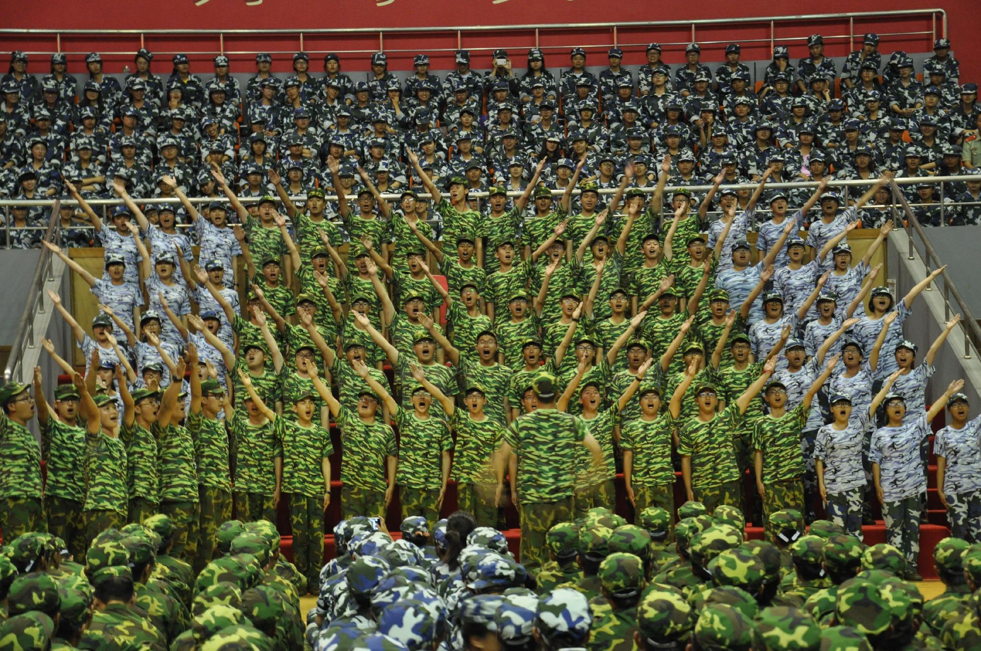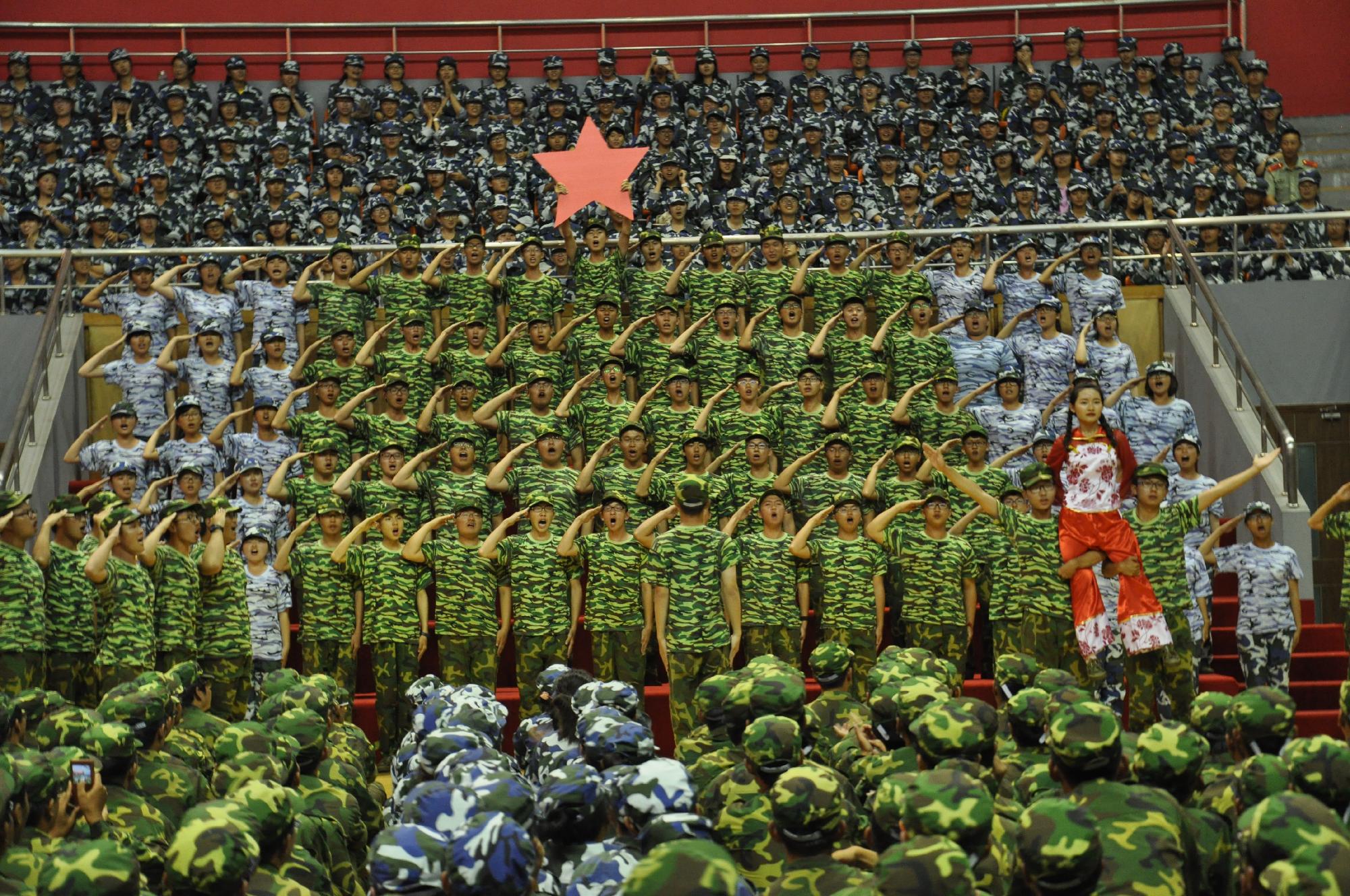 参加比赛的各营代表队个个精神饱满、士气高昂,他们整齐的队列、飒爽的英姿、嘹亮的歌声感染着全场的观众。“军旗列列,脚步声声,天地豪情……”同学们的歌声显得格外铿锵有力。绿色迷彩,璀璨灯光,整个体育馆洋溢着青春的气息。