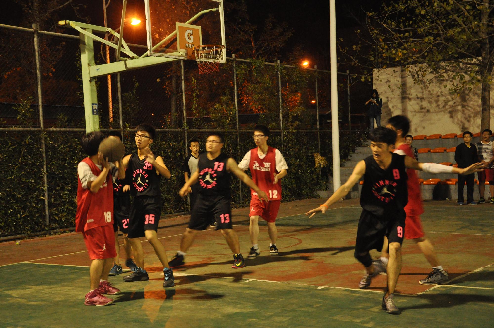 两强相遇,势均力敌,杀入决赛的两支队伍实力旗鼓相当,比赛紧张而富有悬念。一开球,双方队员斗志昂扬,互不相让。第一节比赛结束后,对战双方得分不相上下。随着比赛的深入,双方拼抢愈加激烈,每位球员都全力以赴,积极配合,全场比分一度缩小到1分之差!现场的观众更是激情不减,呐喊声沸腾了整个篮球场。最终,14经济2班凭借着高超的球艺及默契的配合以38:31的比分赢得了本次比赛。