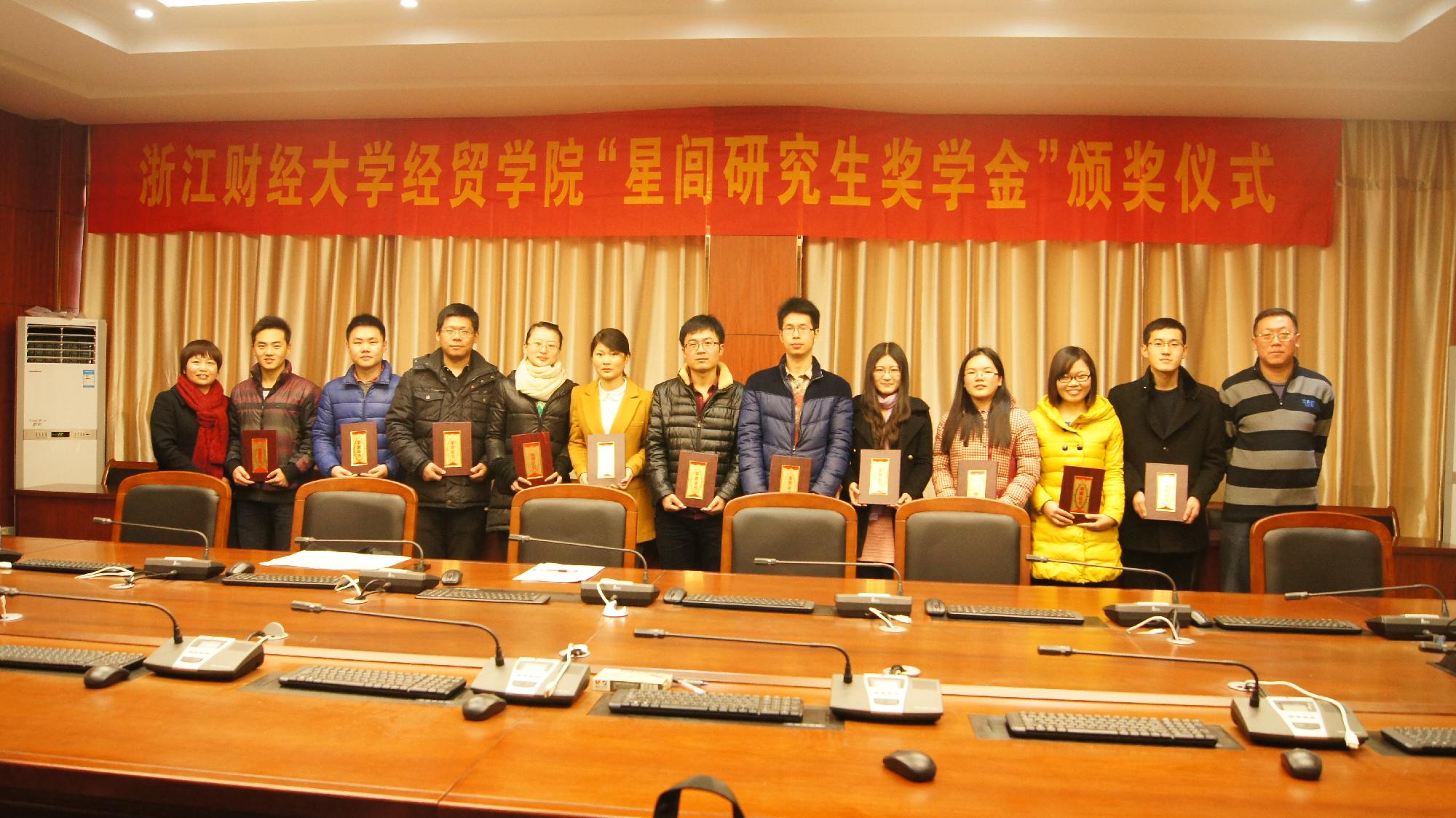 第三届“星闾研究生奖学金”颁奖仪式在210会议室举行,王蔚泉等11名同学获得2014年度“星闾研究生奖学金”荣誉称号,经贸澳门六合彩app