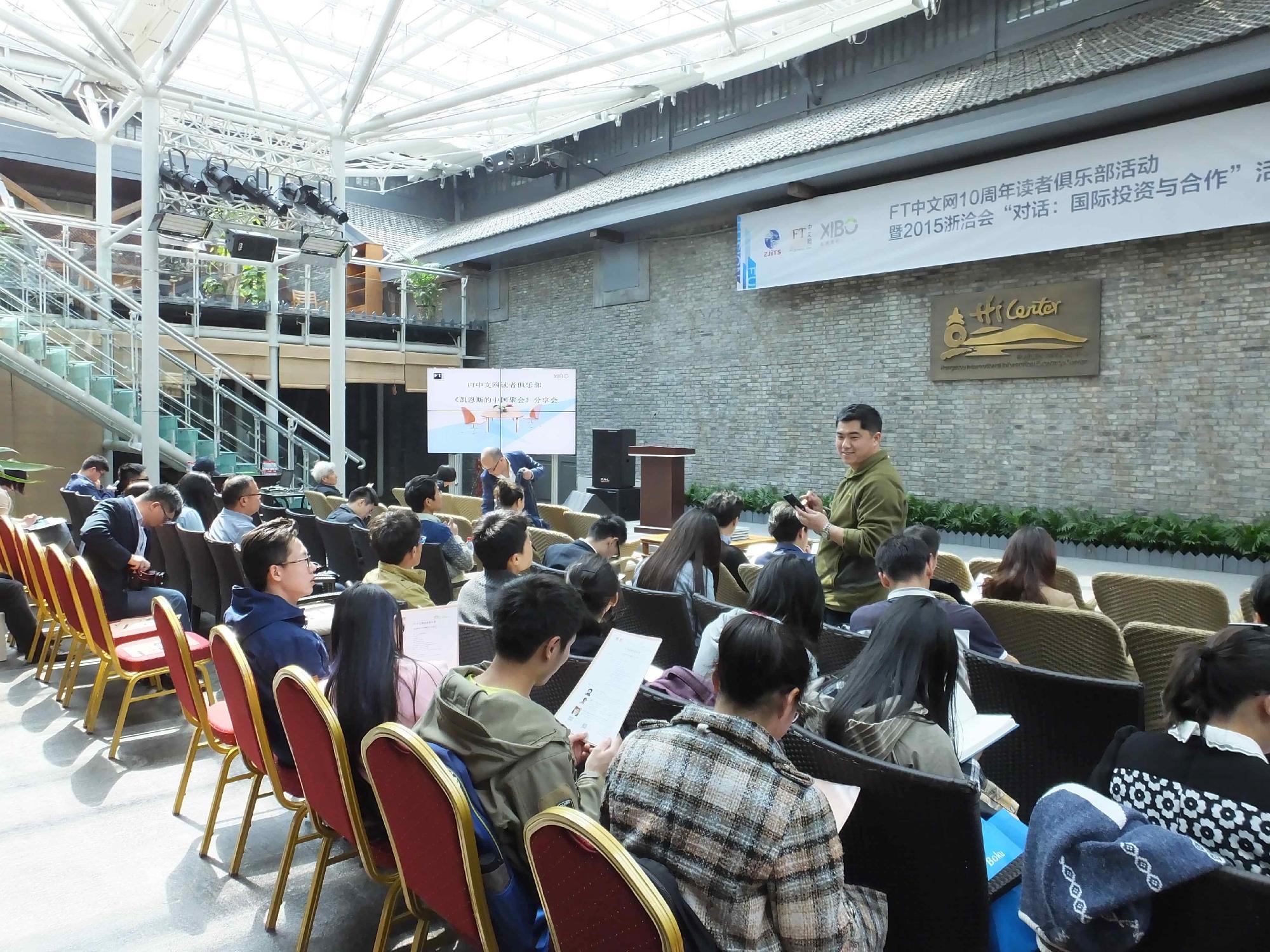 读书会的主会场设在西湖博览会博物馆,主讲人是徐瑾女士和孙涤教授。主讲内容分两块,第一部分是《凯恩斯的中国聚会》主题分享,伴随着徐瑾女士的娓娓道来,一部活灵活现地由人物串接起来的经济史渐渐浮现在读者眼前,其间更伴有对中国经济的分析与预测,道理深入浅出,让人听来欲罢不能。读书会的第二部分是孙涤教授和徐瑾女士关于“新常态”下中国经济学和经济学主题对话,二位嘉宾关于中国经济的过去做了分析,与国际同期做了比较,也对中国经济的未来作出了自己的判断,深刻而不乏味的语言,深深吸引了现场的观众。最后,二位嘉宾对现场观众提问进行了细致回答。