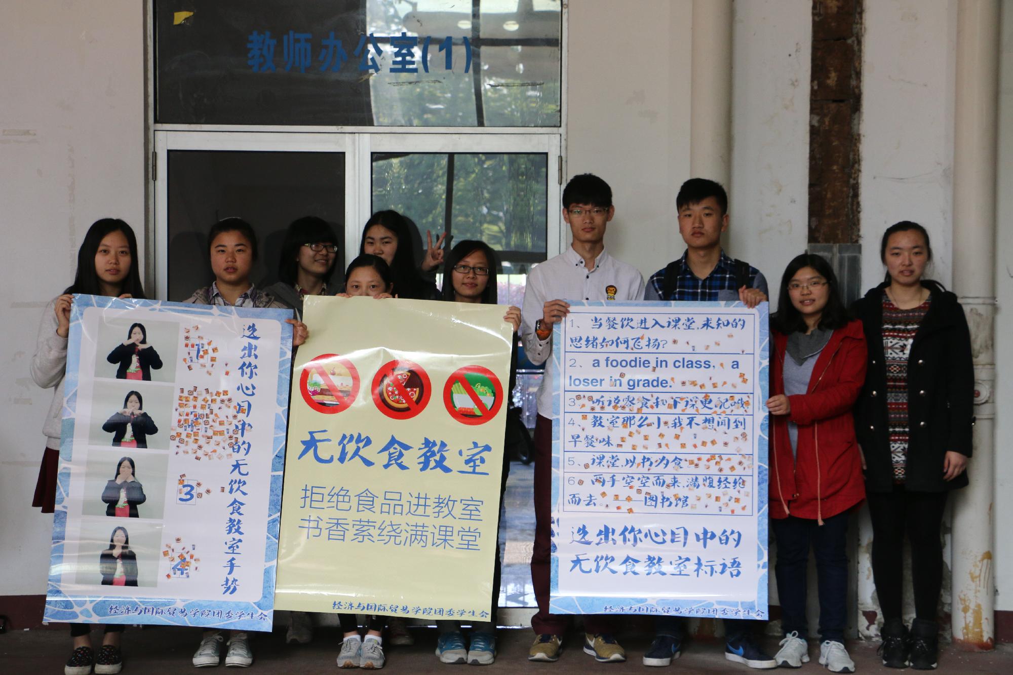 团委学生会每天早上7点半至8点半这个时间段组织志愿者在教学楼、图书馆各门前执勤,通过宣传海报,派发提示卡等形式,提醒同学们不要将食品带入教室。同时,通过线上微信平台宣传、线下现场投票的形式票选出大家心目中“无饮食教室”的劝阻手势和标语,希望以这种形式让更多同学参与到“无饮食教室”的活动中进来。