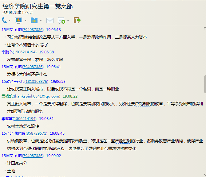 各支部,各班及社团邓读对两会相关热点问题进行了热烈的线上讨论,同学们积极参与,通过QQ群,微信群对就业、高等教育、创新创业、民生等问题进行了交流。其中,第二党支部对两会中“大众创业,万众创新”的话题进行了讨论,指出拥有了众创的平台才能使创新意识和作品有更好的展现空间,也对学校建设创新创业型大学,进一步培养学生创新意识表示支持。第三党支部重点关注了两会中与杭州相关的一些话题,如杭州医改政策,杭州发展模式和G20峰会等,从身边热点出发,具有敏锐的洞察力。研究生第一党支部凭借专业知识对供给侧改革进行热议。在各班讨论中,14经济一班查询了中青舆情检测室检测两会相关信息的数据,显示出国民对两会的关注热度。15国民经济的同学对两会中的“中等收入陷阱”提出了自己的意见。邓小平理论读书协会重点关注了两会中的“中国制造+互联网”,指出通过产品创新走向“中国智造”。